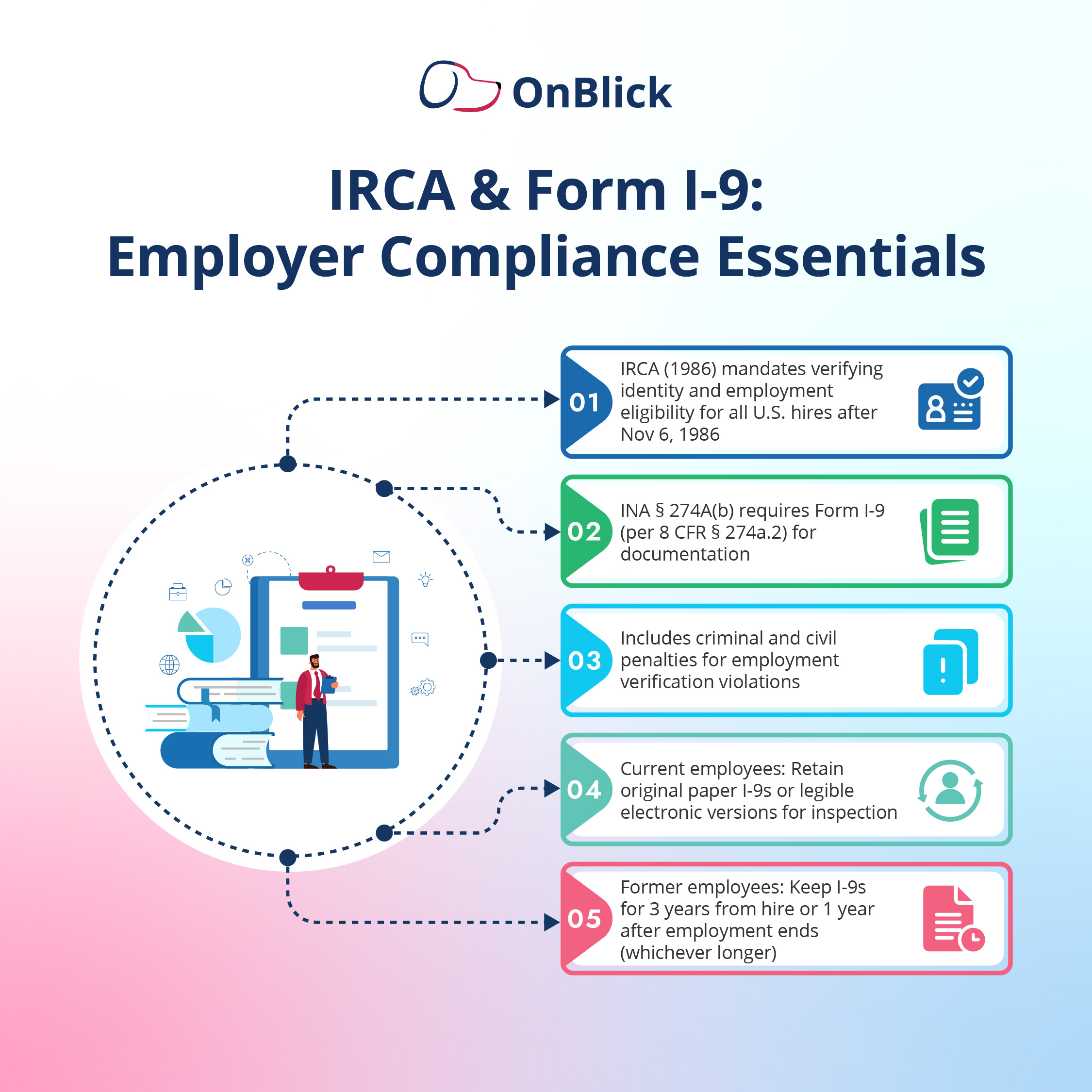 Form I-9, Employment Eligibility Verification, has been one of the major employer compliance requirements since the Immigration Reform and Control Act of 1986 (IRCA). Section 274A(b) of the Immigration and Nationality Act mandates employers to verify the identity and employment authorization of individuals hired in the U.S. after November 6, 1986, and 8 C.F.R. § 274a.2. Form I-9 is the record used to document that process.