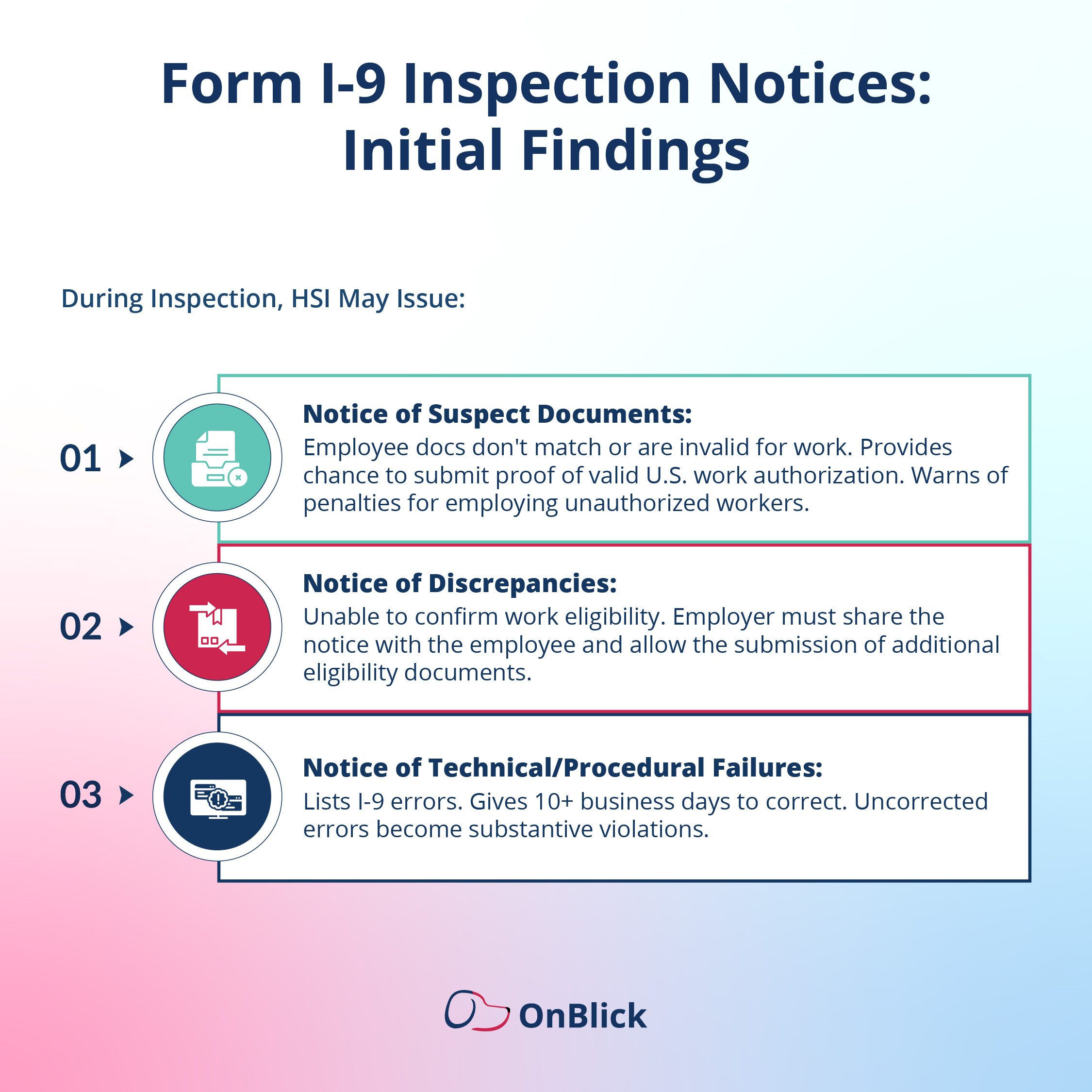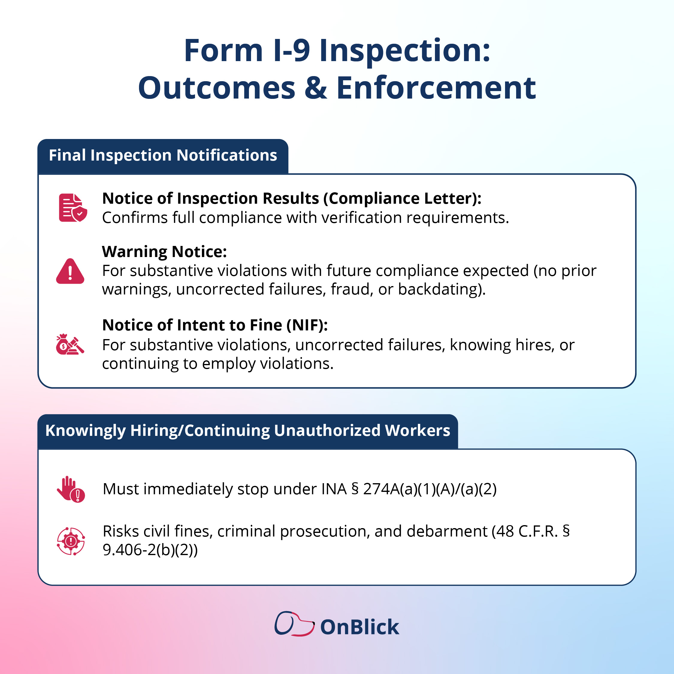 An ICE inspection can end in several different notices. The current ICE fact sheet consistently lists the following outcomes: