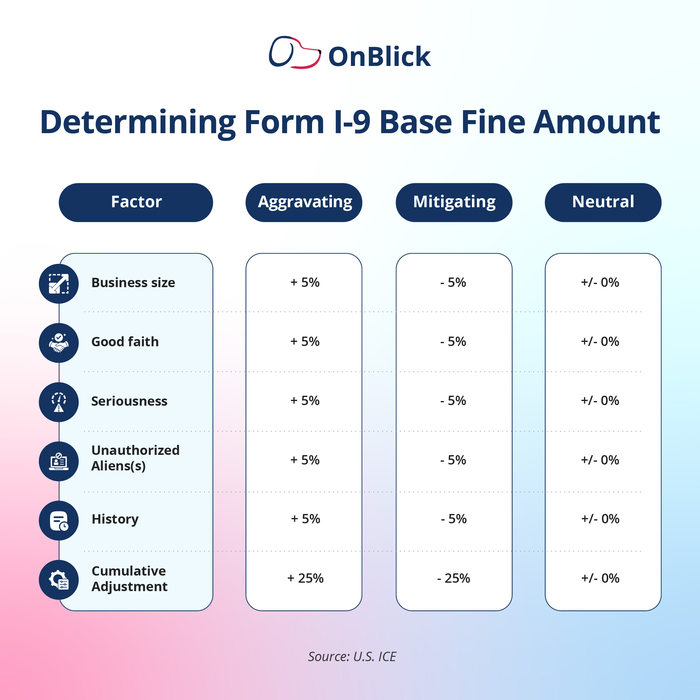 After the base fine amount is determined, ICE considers five statutory factors to decide whether the penalty should be increased, reduced, or left unchanged. They are: