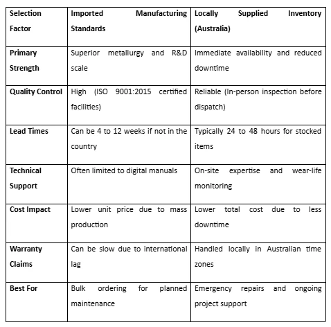 Downtime is your highest hidden cost. If your machine is idle, you are losing money and potentially facing contract penalties. Having local stock means you can get parts in 24 to 48 hours. If you rely solely on direct imports without local backing, you risk weeks of lost productivity.