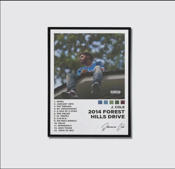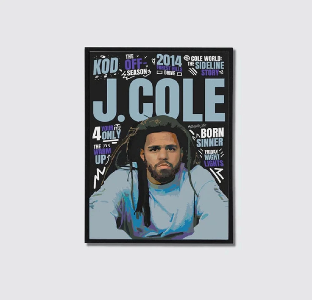 Our most popular posters include artwork inspired by 2014 Forest Hills Drive, KOD, and The Off-Season. These pieces feature striking visuals and iconic themes that resonate deeply with J. Cole fans.