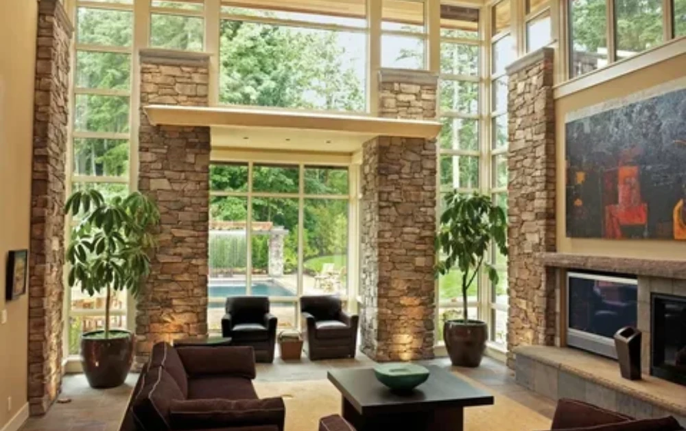Stone cladding brings raw elegance and a sense of permanence. Options include stacked stone, where small layered stones create a rugged yet polished look; slate panels offering smooth, dark tones with a subtle sheen; and pebble or river rock adding organic texture with round shapes. Stone works especially well for accent walls or fireplace surrounds, making them the room’s centerpiece.
