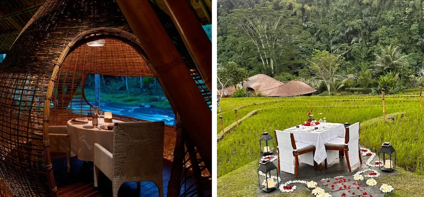 Private villas with their own pools and river views allow mornings to begin with gentle sunlight and the sound of flowing water. Days can be spent exploring traditional Balinese rituals, enjoying couples’ spa journeys, or simply savoring quiet moments together in the lush tropical surroundings.