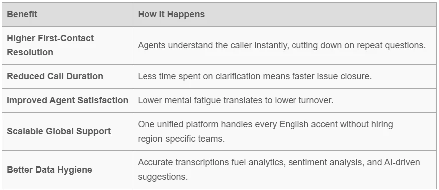 The impact is immediate: agents hear a version of the conversation that matches their own dialect, reducing cognitive load and allowing them to focus on problem‑solving rather than decoding speech.