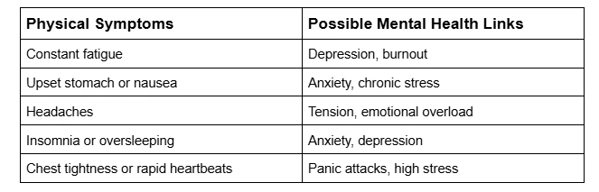 Yes, mental health shows up in the body. Headaches. Stomach issues. Muscle tension. Changes in appetite or sleep. These can all be mental health warning signs, even if they seem like normal wear and tear.