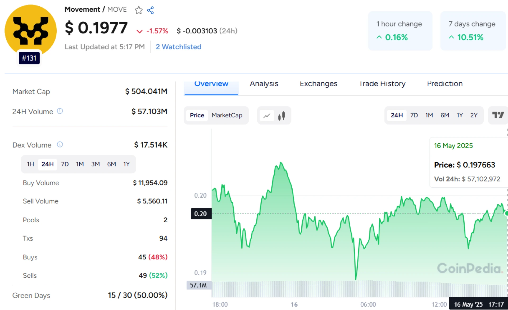 The 24-hour trading volume stands at $57.103 million, and MOVE is down 1.57% over the last day.