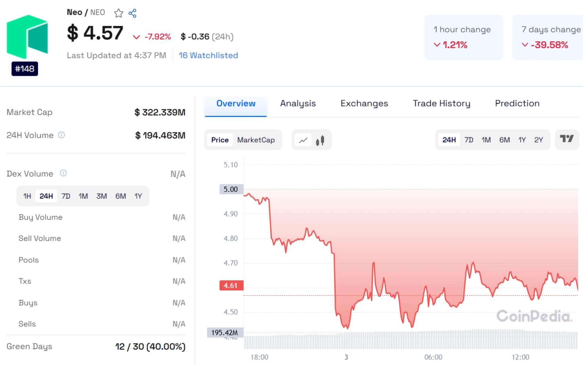 The cryptocurrency market has been hit by significant volatility, and Neo (NEO) is at the center of attention due to an alarming price drop. The coin is currently trading at $4.65, down -7.95% from yesterday and a staggering -35% over the past seven days. This decline is far steeper than the weekly losses recorded by major cryptocurrencies like Ethereum (-9%), XRP (-12%), Solana (-13%), and Dogecoin (-15%).