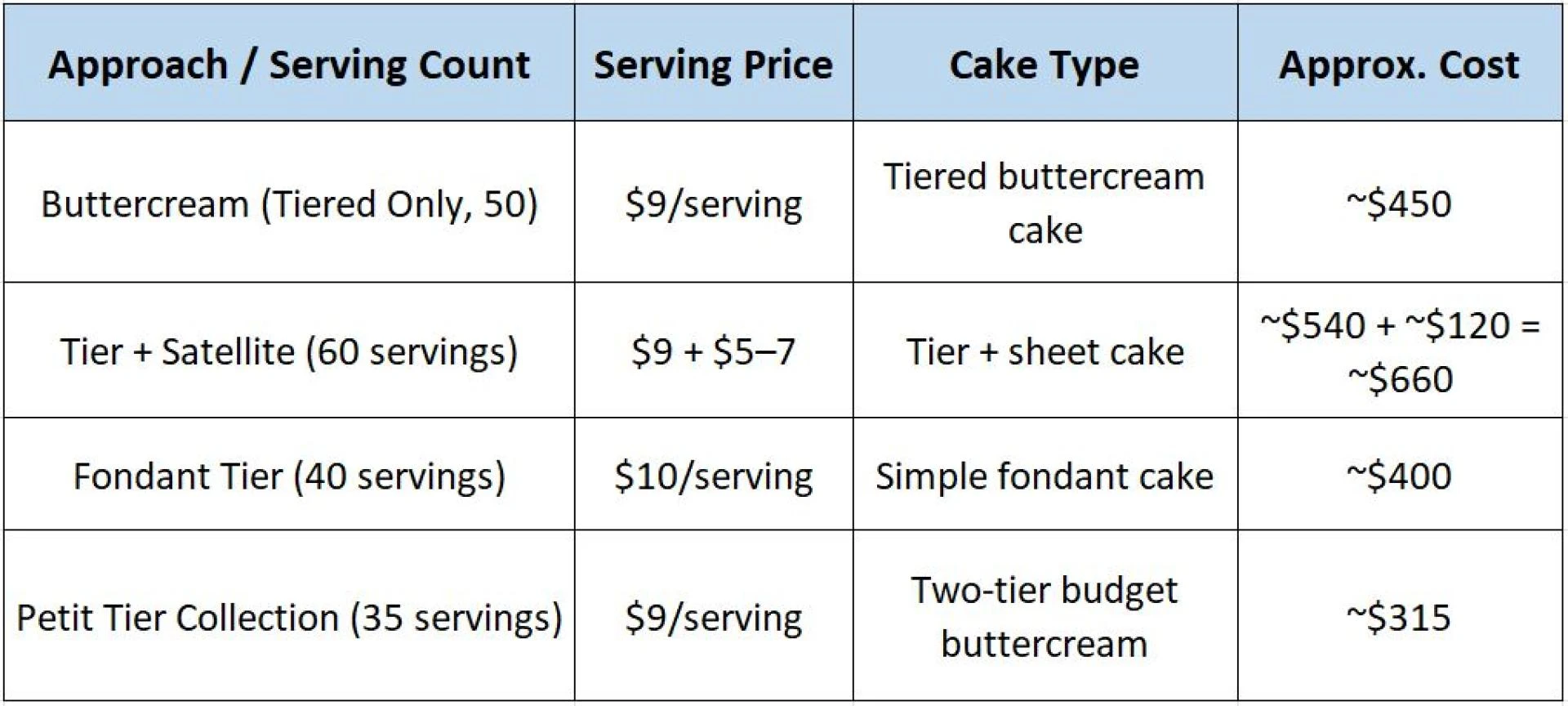 - Cake: Petit Tier buttercream cake (35 servings × $9 = $315)