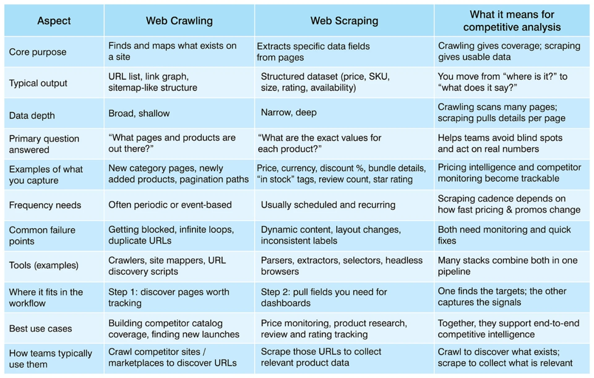 Web crawling maps competitor websites to discover pages, products, and coverage, while web scraping extracts precise data like prices, ratings, and availability. Together, crawling identifies what exists and scraping captures what matters, enabling complete competitive analysis, pricing intelligence, monitoring, and data-driven decision-making across dynamic markets and fast-changing digital ecosystems globally.