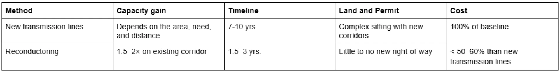 While there will always be demand for new long-distance electric lines, the time spent on obtaining the permit and building is always a big challenge. In comparison, reconductoring allows upgrading existing “highways” faster. Here’s a clear comparison between reconditioning and new electric lines across capacity gain, timeline, land and permit, and cost.