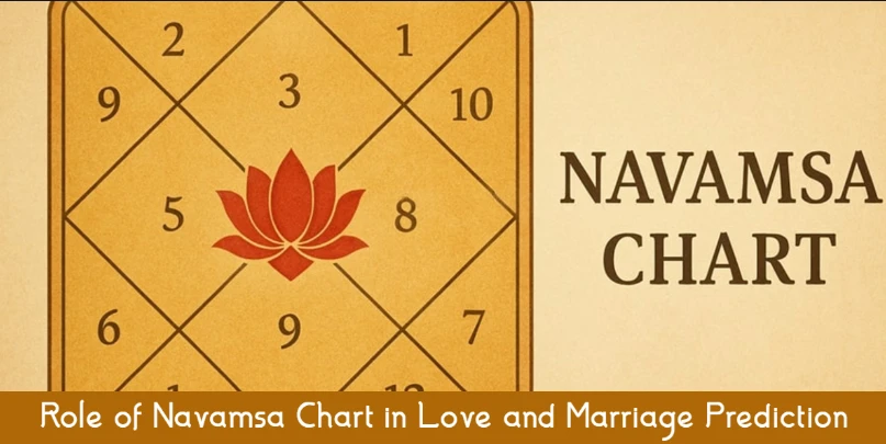Analysis of the Navamsa chart is also important in love marriage predictions. Strong conjunctions between Venus, Mars and Rahu in Navamsa often indicate an unconventional or love marriage. Mars brings passion, Venus adds romance, and Rahu indicates breaking traditional norms. When these planets form harmonious combinations in the D9 chart, the relationship is spared from social pressure and family resistance. If such combinations are afflicted, a love marriage may face frequent obstacles or emotional upheavals. Another major factor in the Navamsa chart is the Moon, which represents emotions and mental satisfaction. A properly placed Moon in Navamsa supports emotional bonding and mutual understanding between partners. If the Moon is afflicted, emotional insecurity, mood swings or lack of emotional fulfilment may arise. Since marriage requires emotional stability, the role of the Moon in the Navamsa chart cannot be ignored when predicting marital happiness.