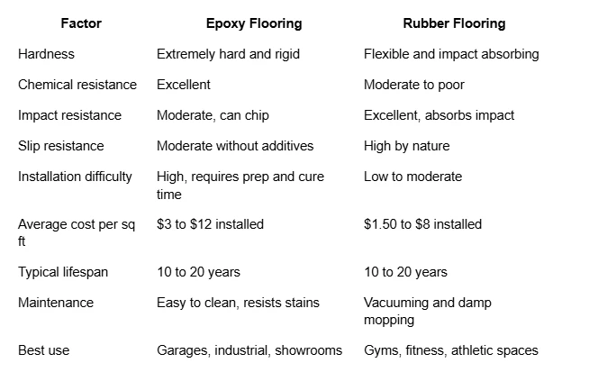 Unlike epoxy, rubber does not bond chemically with the concrete substrate in the same rigid way. It provides cushioning, impact absorption, and slip resistance that epoxy cannot match. Rubber surfaces flex under load rather than resisting it rigidly, which makes a significant difference when the application involves dropped weights, heavy equipment, or people training for extended periods.