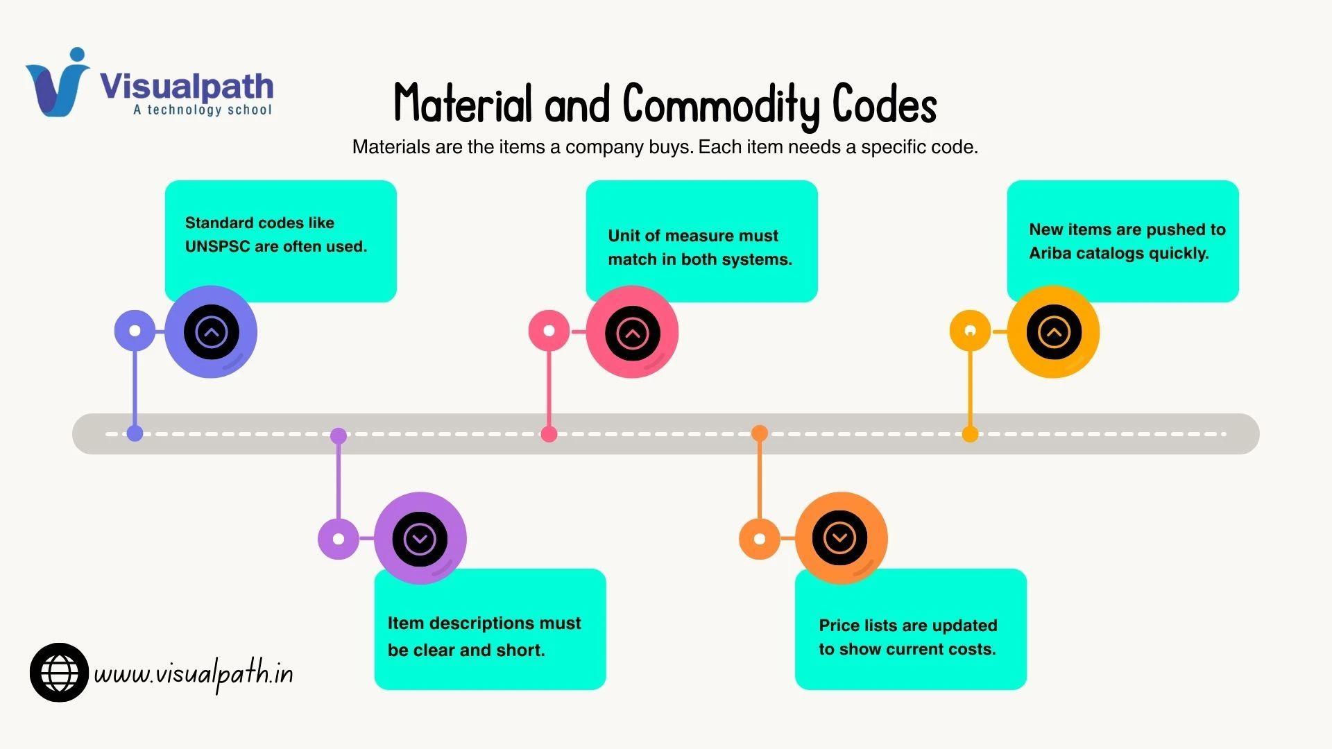 Materials are the items a company buys. Each item needs a specific code. Commodity codes group these items into sets. For example, all laptops might have one code. This help managers see where money is spent. Integration ensures Ariba knows what the ERP is selling.