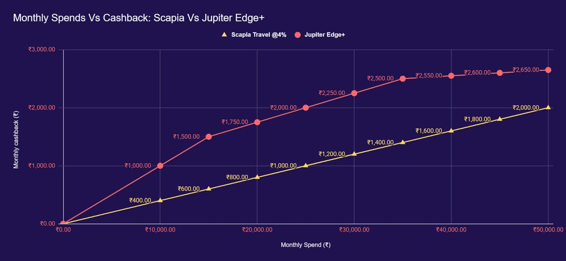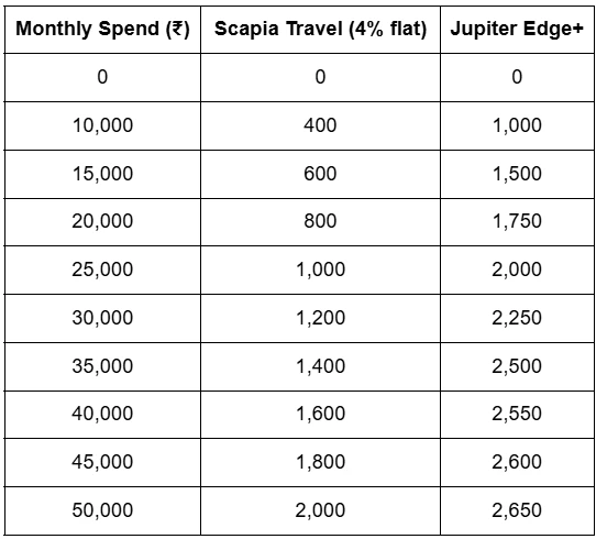 - At ₹10,000 spend, Jupiter Edge+ (₹1,000 cashback) delivers 2.5x more than Scapia (₹400).