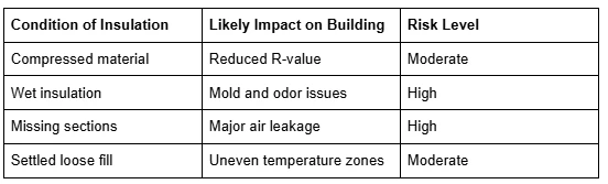 Maintenance teams may see loose batts near ductwork or exposed wall cavities.