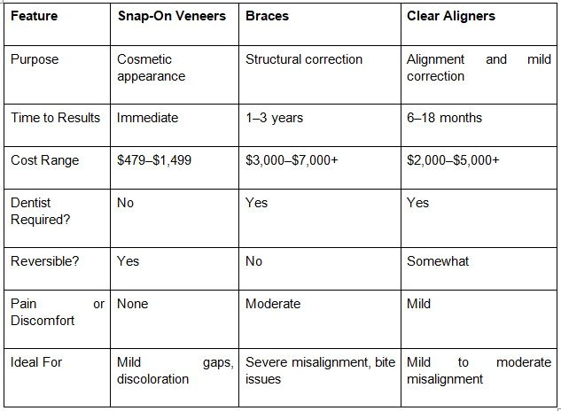 ● No Substitute for Orthodontic Care - If the teen has serious alignment issues, jaw pain, or bite problems, snap-on veneers are cosmetic only—they do not move teeth.