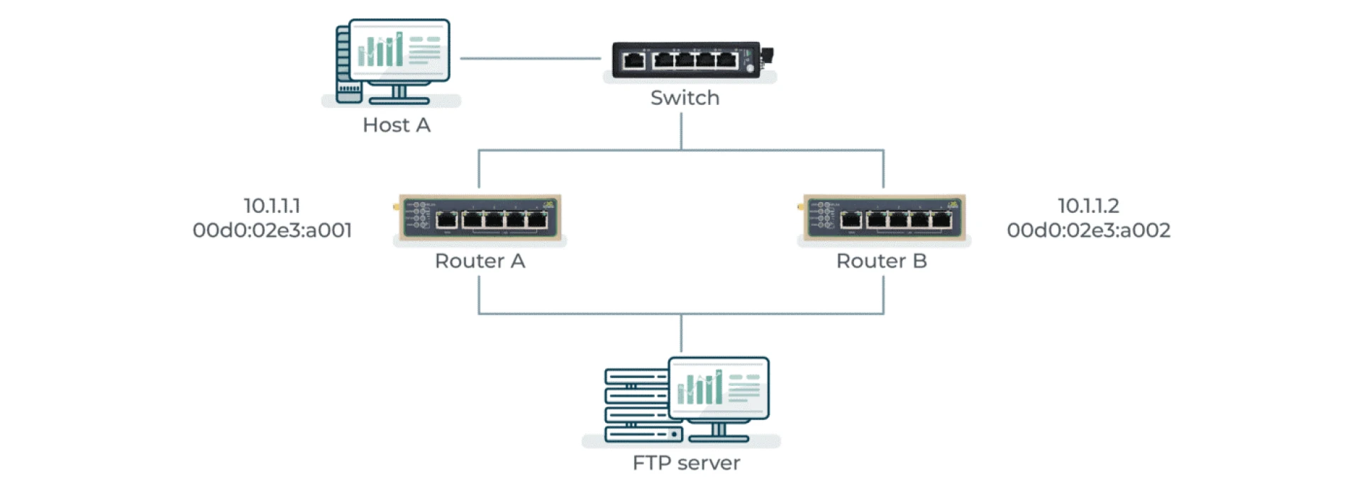 As shown in the figure below, there are two routers and two gateways. One of the two routers is selected as the primary router, and the others are backup routers. The primary router is responsible for forwarding datagrams, while the backup router is in an idle state. When the primary router fails, the backup router will become the primary router, replacing the primary router to realize the forwarding function.