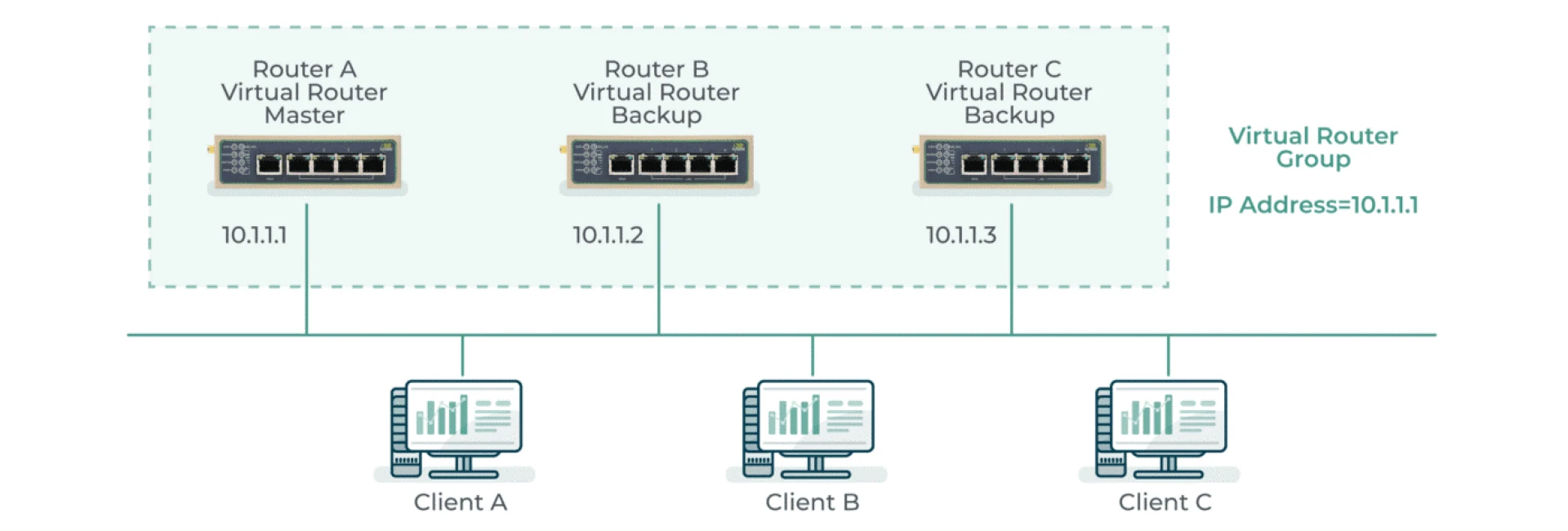As shown in the figure below: RA, RB and RC are VRRP routers, which form a VRRP backup group. RA is the main router, while RB and RC are backup routers. These three routers look like one from the outside, thus forming a virtual router Router Group. The virtual router has a virtual IP address of 10.1.1.1 (the IP of the main router of RA). RA is the owner of the IP address and the main router.