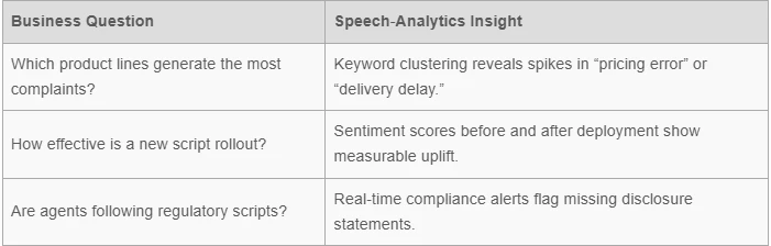 Beyond QA, speech analytics enriches call center analytics software by feeding structured data into dashboards that answer strategic questions: