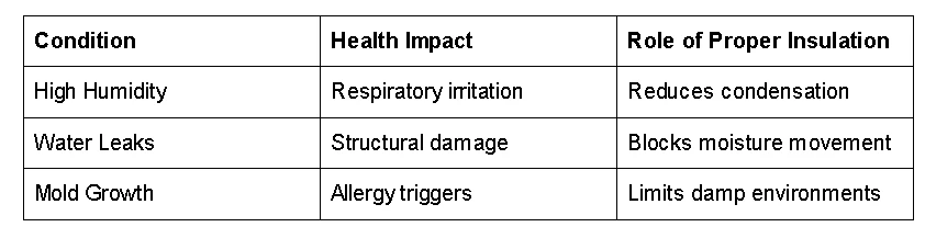 Insulation supports healthier indoor environments by improving air quality, controlling moisture, and stabilizing temperature. It reduces exposure to pollutants and limits conditions that encourage mold growth.