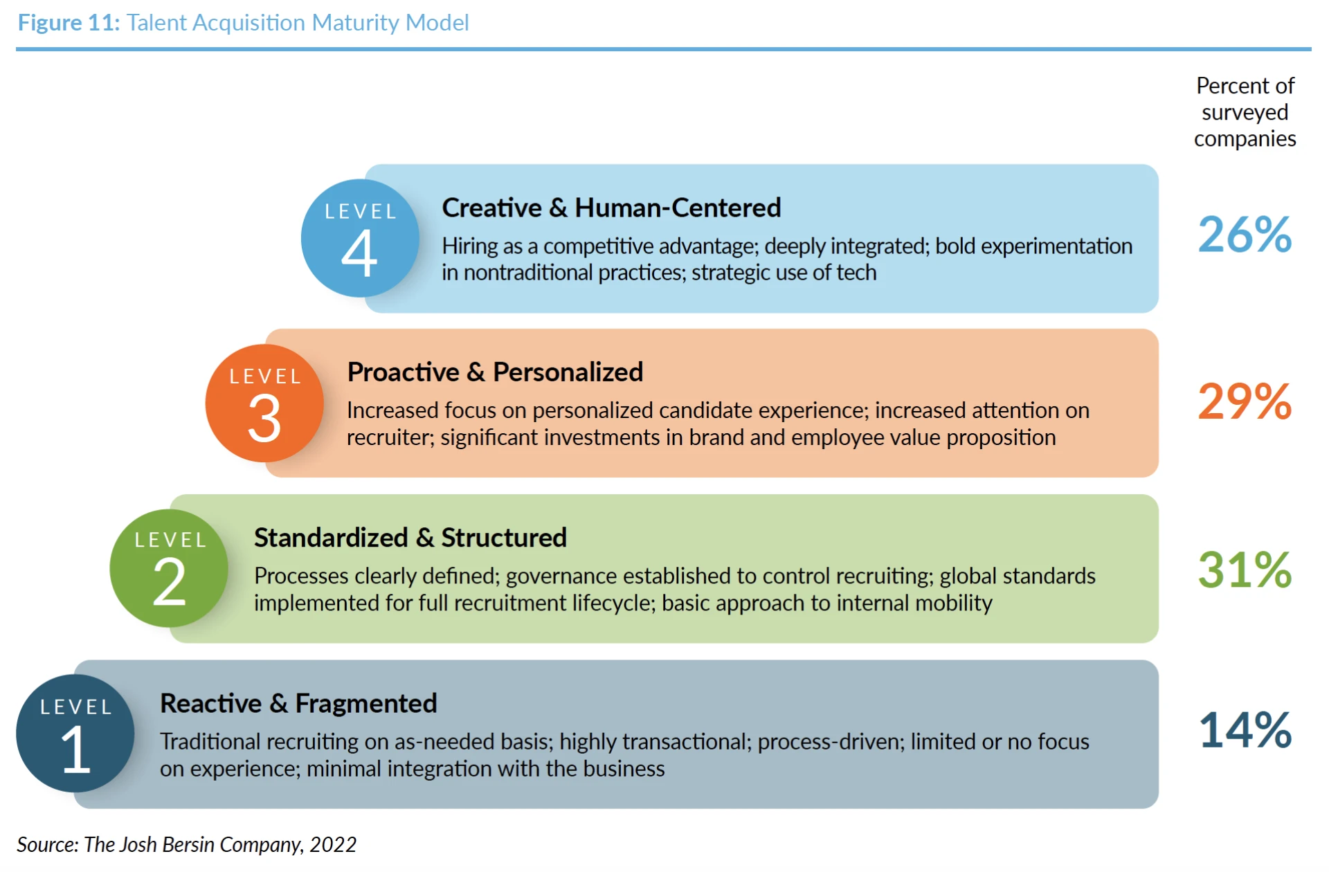 This shows the maturity levels of organizations with regards to their talent acquisition processes and the percentage of companies surveyed at each level.