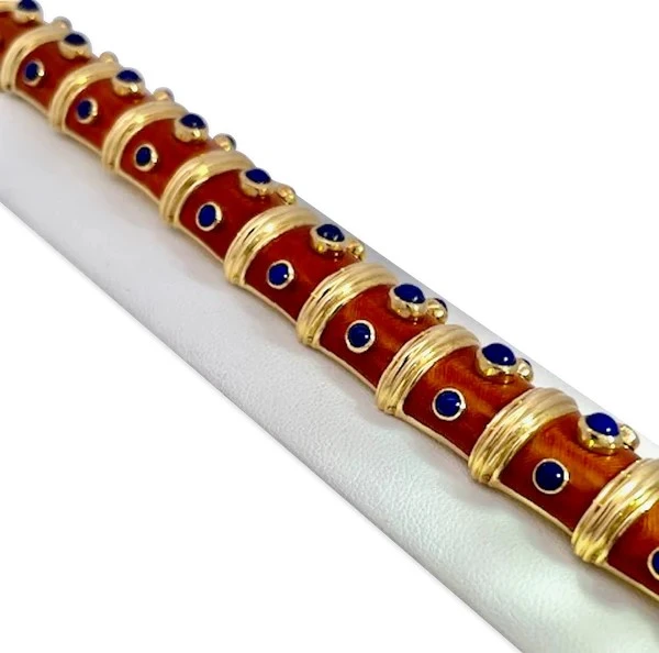Enter the 18K Guilloché Enamel Bracelet with Lapis Lazuli Inserts.