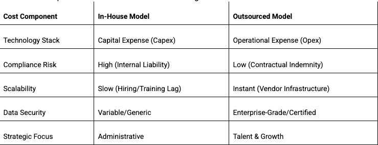 When organizations analyze Total Cost of Ownership (TCO), outsourcing yields clear efficiency gains. It converts fixed operational costs into variable costs aligned with headcount.