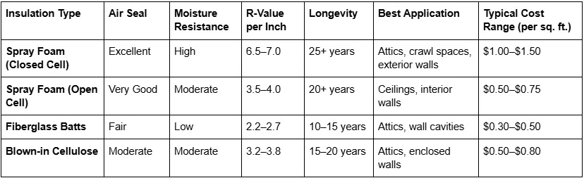 Spray foam insulation, while initially more expensive, often provides the best balance of moisture control, air sealing, and long-term savings. Fiberglass remains popular for affordability, and cellulose offers eco-friendly benefits with recycled content.