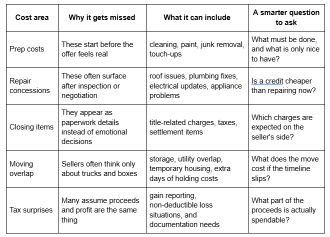 The hidden costs of selling a house are not always dramatic, but they are powerful because they stack. Prep costs, concessions, closing items, timing pressure, and taxes can all narrow the distance between what a home sells for and what the seller actually keeps.