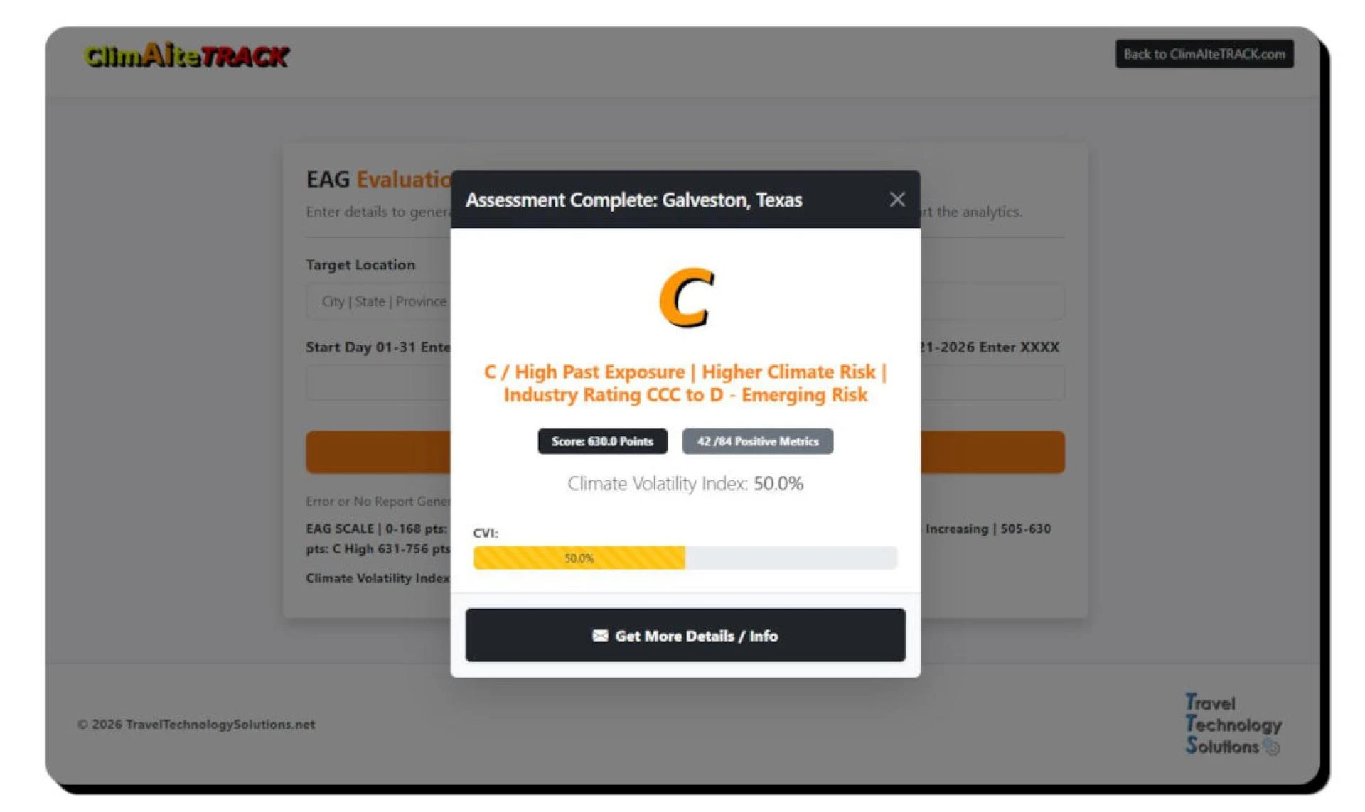 The 2nd Generation of ClimAIteTRACK (CTRACK2.0) is now available for tryouts at the Evaluation Portal. Get a detailed ‘Environmental Assessment Grade’ for any location and see DPPM strategy in action based on data. As ClimAIteTRACK rolls towards deployment, the technology will be fully integrable with existing systems and can manage data acquisition, cleaning and formatting within its own functionality. ClimAIteTRACK’s script is layered and can be optimized and ‘fine tuned’ for specific business and geographic uses. Consumer facing elements from ClimAIteTRACK are customizable and can maintain in-house brand schema and stylizations. Increasing climate change means more unpredictable and severe weather events, driving costs for most industries. ClimAIteTRACK is a new tool for managing premium revenue and maintaining customer relationships in the current environmental landscape. Online evaluation is live and can be accessed here: https://traveltechnologysolutions.net/EvalPortal/