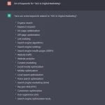 Chat GPT can provide a list of relevant keywords. For instance, to test this functionality, I searched the keywords related to "SEO in Digital Marketing" After a few seconds, the chatbot presented me with a list of keywords and phrases.
