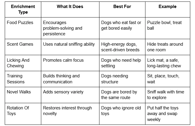 - Short daily enrichment routines can help reduce barking, chewing, and restlessness.
