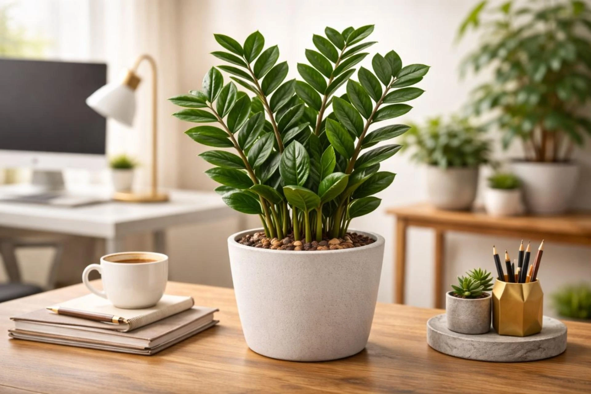 The ZZ plant stores moisture in underground rhizomes, making it one of the most neglect-resistant indoor plants available. It thrives in offices and low-light corners.