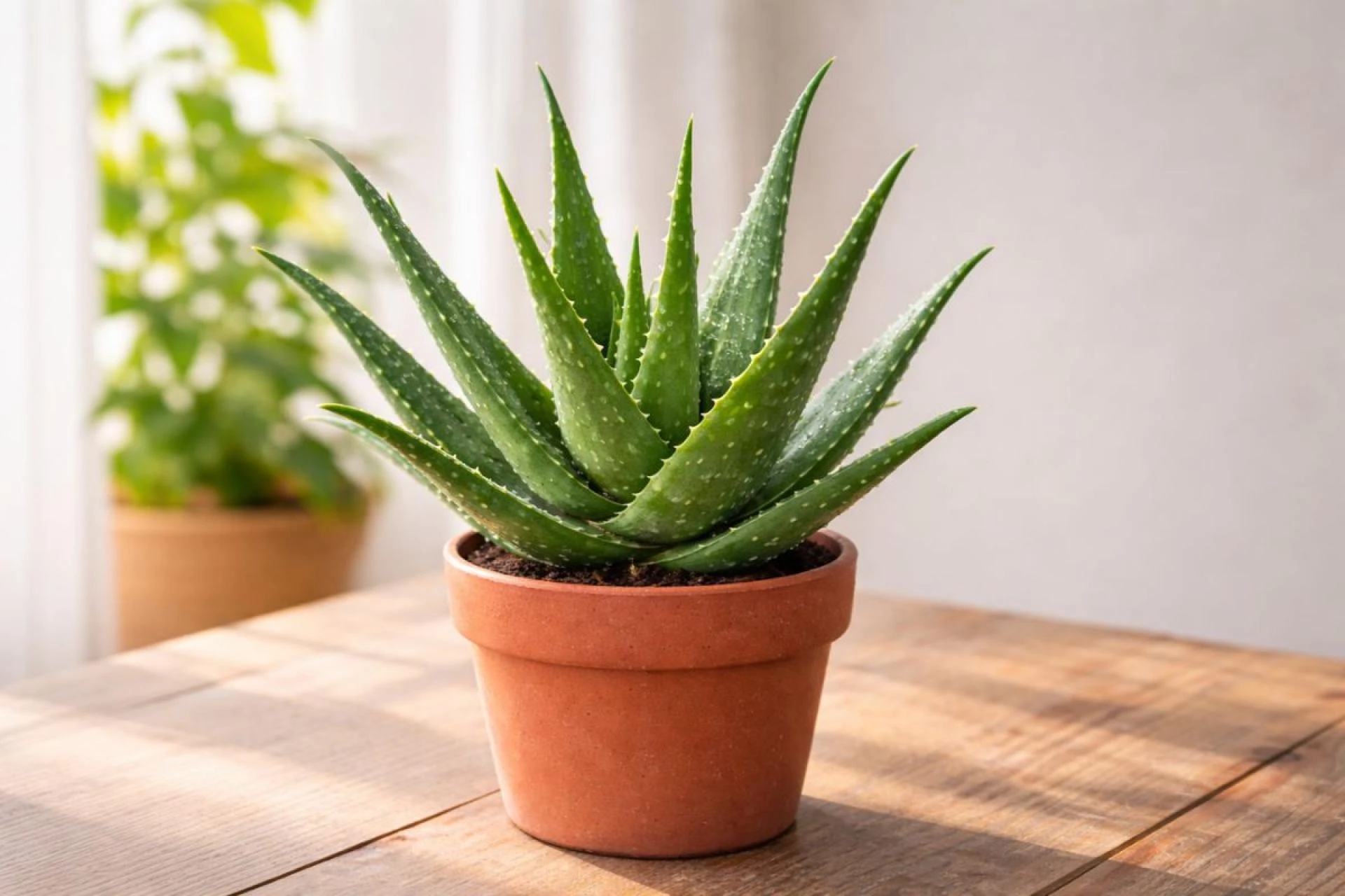 Aloe vera is a succulent that stores water in thick leaves. It prefers bright light but can handle occasional neglect and infrequent watering.