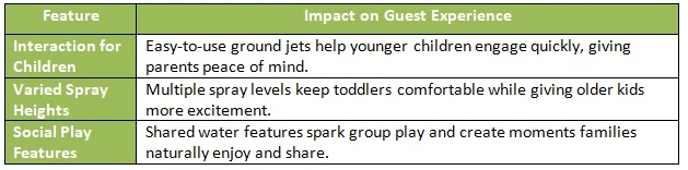 Water jets with different heights, or spray patterns tend to hold people's attention for longer. Instead of racing through these features once and then moving on, children frequently pause to observe how the jets react. This benefits parents as well. When children are engaged and settled, parents frequently feel more at ease, and this sense of comfort eventually influences whether families decide to return.