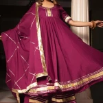 The attractive Anarkali Set is designed in pure cotton. Gotta lace work makes it more elegant and beautiful. Gotta Jaal work all over the dupatta gives it a classic look.