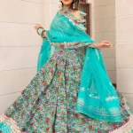 The gorgeous Mint green lehenga is designed in Taffeta Silk. Gotta lace work to highlight the beauty of the dress. Organza Silk Dupatta with a floral print pattern makes this outfit more eye-catching. Gotta lace work on the dupatta to give it a trendy look.