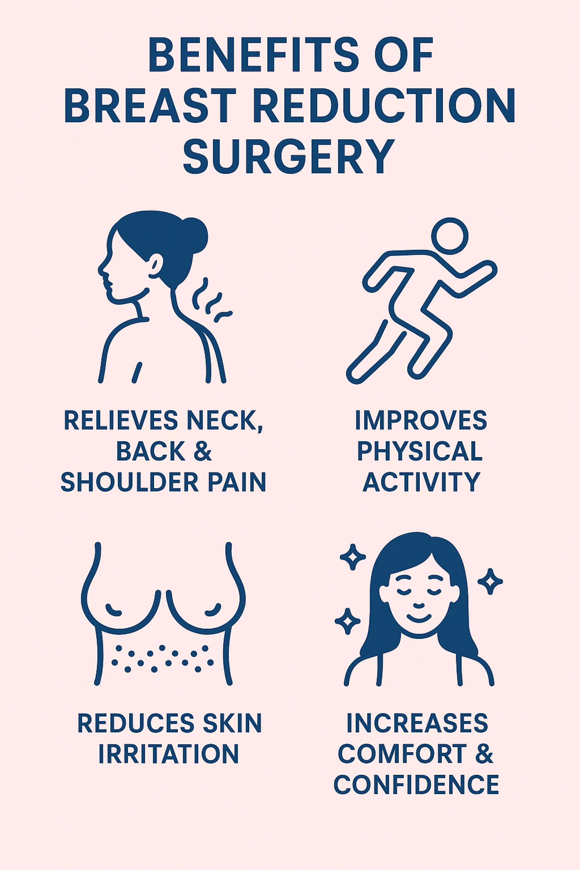 Excess breast tissue can cause skin irritation, rashes, or infections under the breast fold. Breast reduction removes these concerns by reducing skin-on-skin contact and improving ventilation.