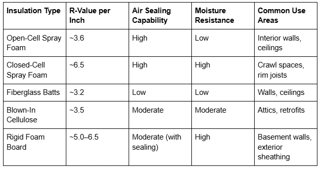 Understanding how each insulation performs based on R-value (thermal resistance), air sealing ability, and moisture control helps narrow choices.