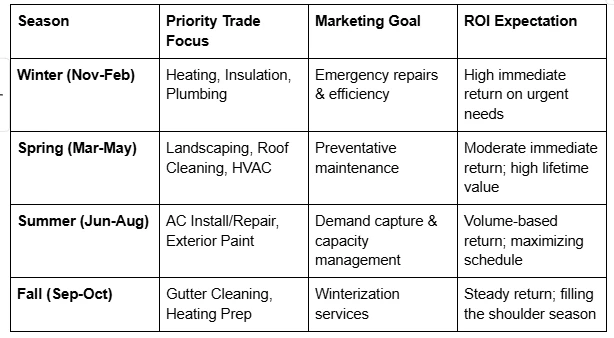 The following table illustrates how marketing focus should shift throughout the year to maintain positive ROI for local trades.