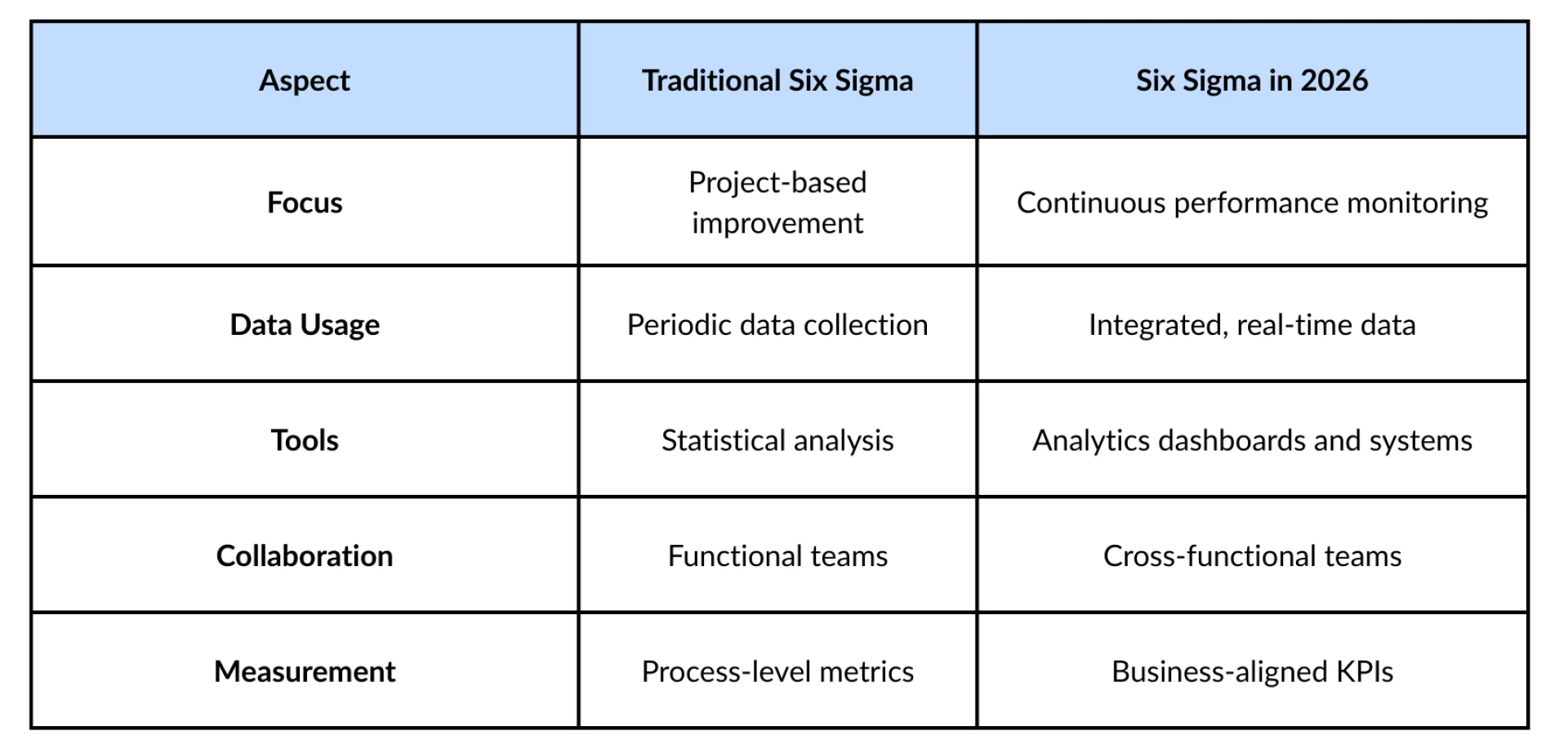 Six Sigma in 2026 is no longer limited to isolated improvement projects. Organizations now apply its principles as part of ongoing operational management. This section explains how Six Sigma practices are shifting to align with faster decision cycles and broader organizational goals.