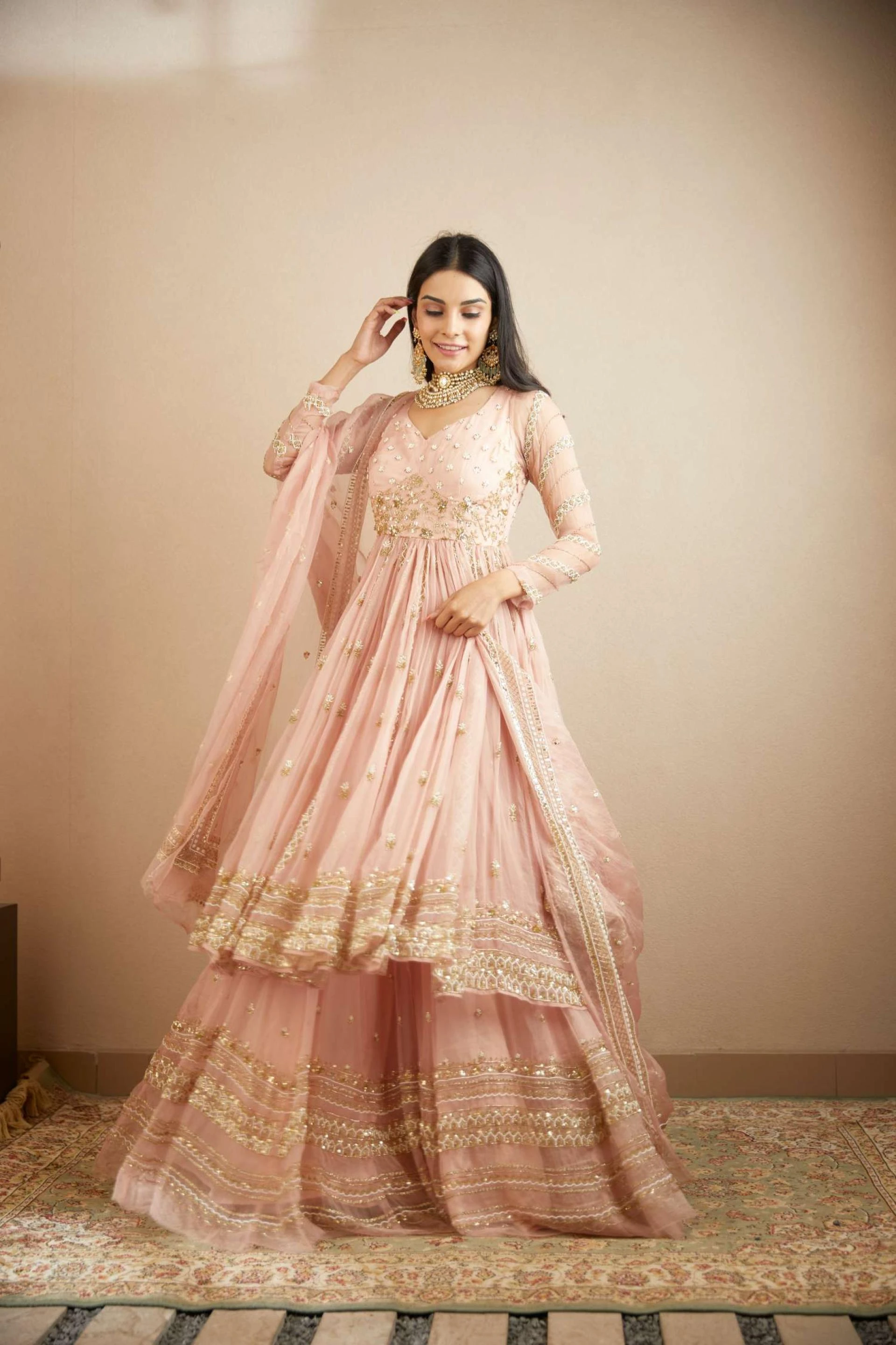 When shopping for an online lehenga for women, choose one that allows easy movement since you'll likely spend a lot of time dancing. Sangeet gowns with sequins and anarkali gowns are the best options to use during the party, especially on the night of a wedding. Paaro has some of the best festal lehengas and sequin anarkali gowns.