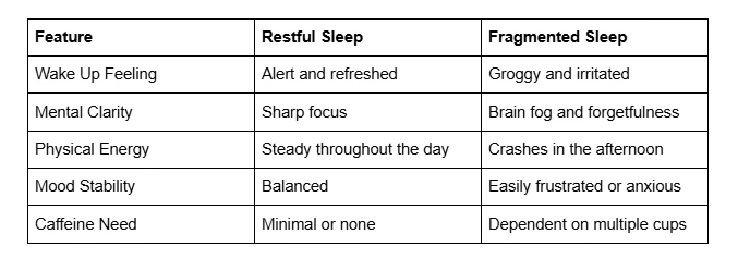 It is helpful to look at how restful sleep differs from fragmented sleep. The following table highlights the differences in how the body feels and functions under both conditions.