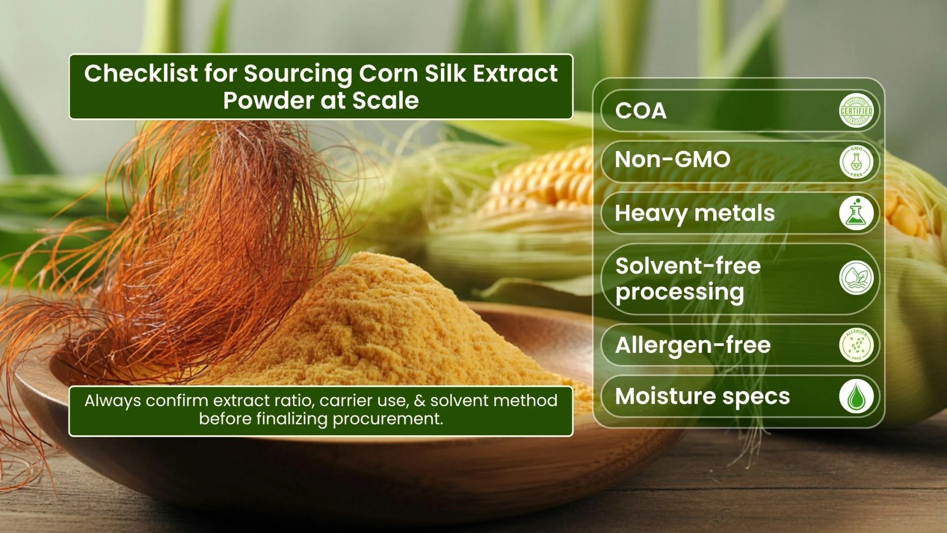 When sourcing corn silk extract powder 10:1 at scale, procurement professionals should focus on traceability, solvent system, and extract standardization. Always verify the declared 10:1 ratio with supplier documentation and ensure the absence of carriers or additives if clean-label compliance is essential.