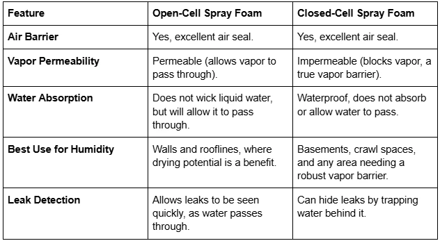 Both open-cell and closed-cell spray foam are excellent for humidity control, but they work differently and are suited for different applications.