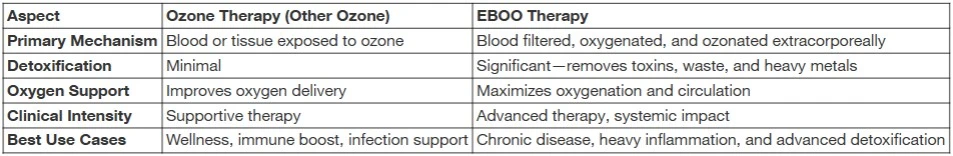 Think of ozone therapy as a solid foundation—and EBOO as the advanced architecture built on top. Both have value, but their scope and depth of impact differ significantly.