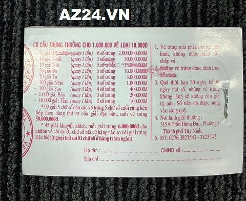 + Ngoài cùng bên trái sẽ có in 2 nửa con dấu, tiếp theo đó là “Cơ cấu trả thưởng cho 1.000.000 vé loại 10.000 đồng 6 chữ số” gồm 9 giải chính, 9 giải phụ, 45 giải khuyến khích với chi tiết về số lượng giải và giá trị của mỗi giải XSTNINH.