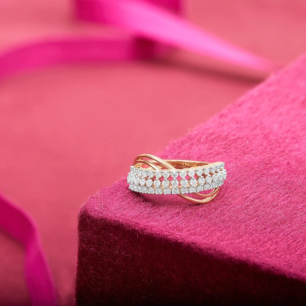 Sleek, sculptural, and sophisticated—this 18Kt rose gold band features a curved design that hugs the finger gracefully. Set with a delicate row of diamonds, it’s the go-to choice for modern brides or women who love stacking bands but don’t want to invest in multiple rings.